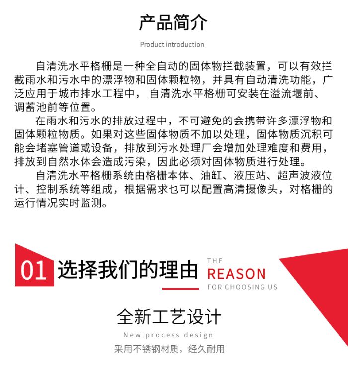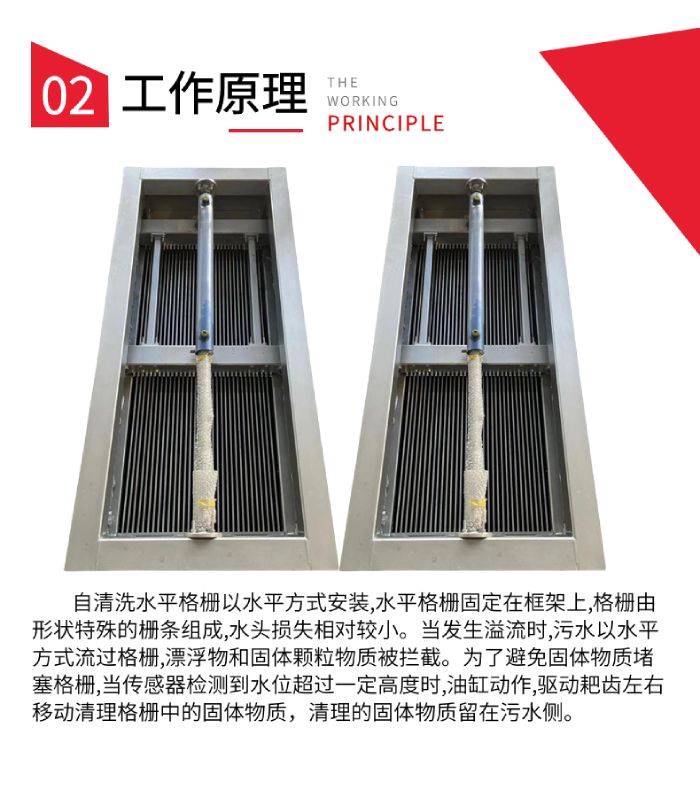 自清洗水平格柵是一種全自動的固體物攔截裝置,可以有效攔截雨水和污水中的漂浮物和固體顆粒物,并具有自動清洗功能,廣泛應(yīng)用于城市排水工程中, 自清洗水平格柵可安裝在溢流堰前、調(diào)蓄池前等位置。在雨水和污水的排放過程中,不可避免的會攜帶許多漂浮物和固體顆粒物質(zhì)。如果對這些固體物質(zhì)不加以處理,固體物質(zhì)沉積可能會堵塞管道或設(shè)備,排放到污水處理廠會增加處理難度和費用,排放到自然水體會造成污染,因此必須對固體物質(zhì)進行處理。自清洗水平格柵系統(tǒng)由格柵本體、油缸、液壓站、超聲波液位計、控制系統(tǒng)等組成,根據(jù)需求也可以配置高清攝像頭,對格柵的運行情況實時監(jiān)測。