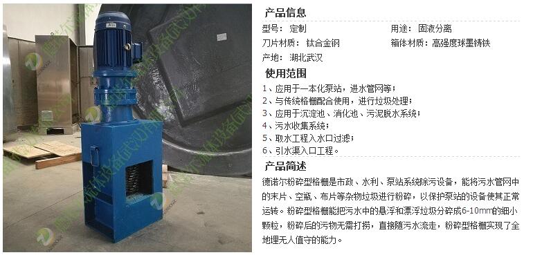主體設(shè)備的安裝粉碎型格柵一般為整體設(shè)備,安裝時一般只需進(jìn)行吊裝及電氣接線。安裝后,必須檢查設(shè)備底部是否有渠道底緊密結(jié)合,無傾斜;設(shè)備兩側(cè)是否與導(dǎo)軌結(jié)合牢固,無晃動。而且必須注意設(shè)備與迎水面垂直,保證大的過水面,同時也保證均勻分布刀片組及轉(zhuǎn)鼓的負(fù)荷。電氣接線完成后,須進(jìn)行試機(jī),保證運(yùn)行平穩(wěn),刀片組及轉(zhuǎn)鼓轉(zhuǎn)向正確。 粉碎型格柵運(yùn)行使用注意事項經(jīng)過對幾十個地埋式泵站的跟蹤調(diào)查,發(fā)現(xiàn)部分粉碎型格柵連續(xù)運(yùn)行7年多未出現(xiàn)故障,而也有部分格柵運(yùn)行1、2年甚至更短的時候就出現(xiàn)嚴(yán)重故障。由于污水的水質(zhì)及水中的雜物種類繁多,運(yùn)行工況條件相差很大,從而出現(xiàn)的故障及故障頻率也不盡相同。粉碎型格柵運(yùn)行中出現(xiàn)的常見問題主要有: